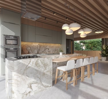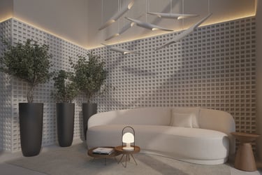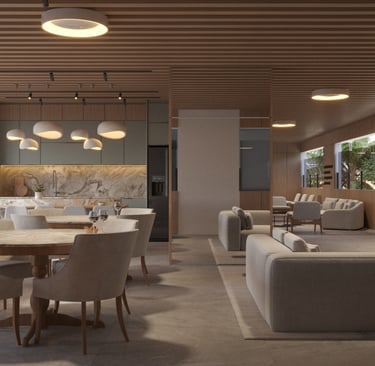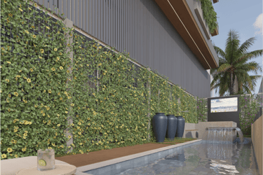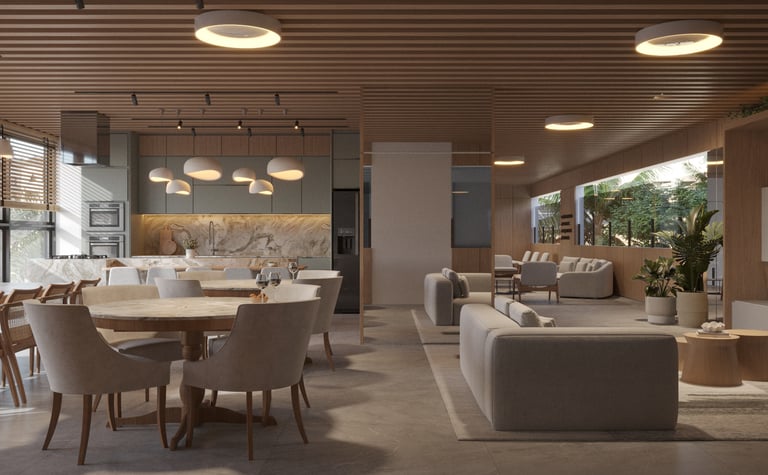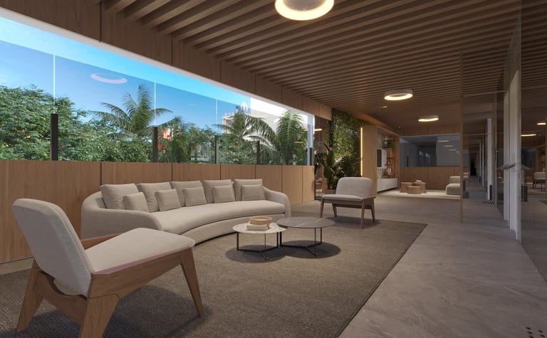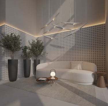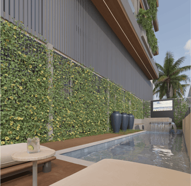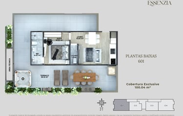 A área social do ESSENZIA é um espetáculo à parte, oferece muita versatilidade sendo composta por hall de entrada com pé direito duplo e jardim além de lazer completo com piscina e fireplace no pavimento térreo, já o pavimento mezanino integra lounge relax, espaço gourmet e salão de festas, coworking, fitness e lavanderia.