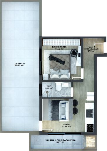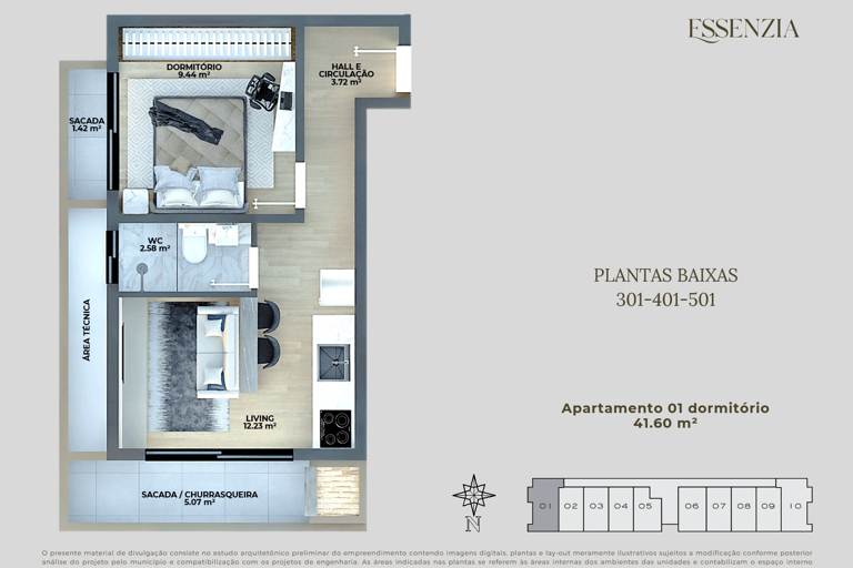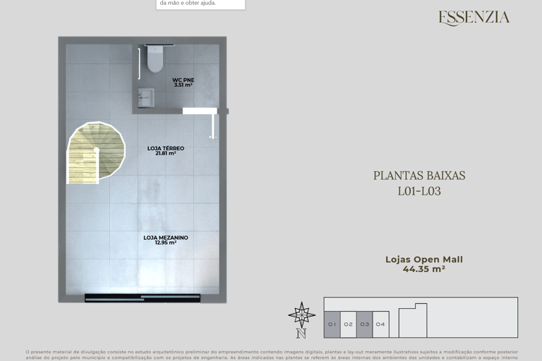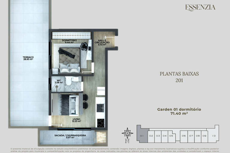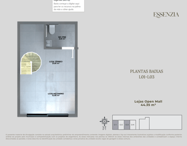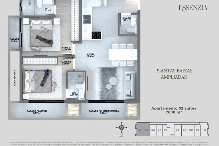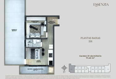 O presente material de divulgação consiste no estudo arquitetônico preliminar do empreendimento contendo imagens digitais, plantas e lay-out meramente ilustrativos sujeitos a modificação conforme posterior análise do projeto pelo município e compatibilização com os projetos de engenharia. As áreas indicadas nas plantas se referem às áreas internas dos ambientes das unidades e contabilizam o espaço interno descontadas as paredes. A área descrita na identificação da unidade contabiliza a área privativa da unidade exceto vagas de garagem e áreas comuns.